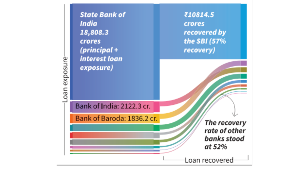 State Bank of India (SBI) is owed over ₹22,000 crore, followed by Punjab National Bank and Bank of India. The chart below shows the Amount owed to the banks and the amount recovered.