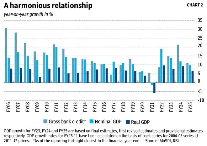 In FY23, gross bank credit grew 15 per cent and nominal GDP grew 14 per cent. In FY24, credit grew 21 per cent, but GDP grew 12 per cent. As credit growth fell to 11 per cent in FY25, GDP growth, too, moderated and recorded a growth of 10 per cent. If one had been tracking the trend in credit growth (fortnightly), the moderation in GDP growth wouldn’t have come across as a surprise (Chart 1). Hence, by tracking credit growth, investors can make a decent assessment of the vigour of economic activity and make inferences on how this could impact market sentiment.