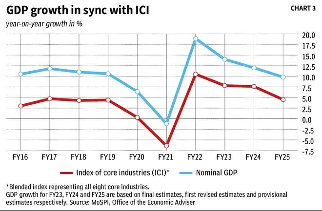 Like credit growth, ICI also has a near-perfect positive correlation with nominal GDP, with a coefficient of 0.9905 for data between FY12 and FY25. After a spell of good growth – 7.8 per cent in FY23 and 7.6 per cent in FY24, the index moderated to a growth of 4.5 per cent in FY25, which showed in nominal GDP as well. Reiterating, nominal GDP grew 14 per cent in FY23, 12 per cent in FY24 and 10 per cent in FY25.