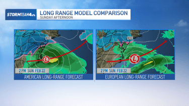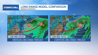 How the storm plays out Sunday night into Monday becomes a much bigger question. The long-range models deviate at this point.